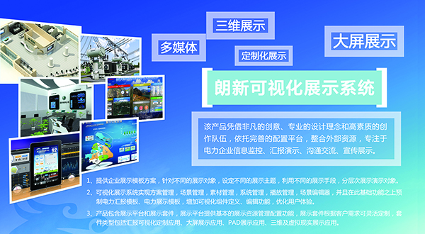 該產品憑借新穎的創意、專業的設計理念,依托完善的配置平臺,整合外部資源,專注于電力企業信息監控、匯報演示、溝通交流、宣傳展示,致力于樹立良好的企業形象,對外增強與公眾的溝通與交流,拉近與客戶的距離,提升企業透明度,對內總結建設成果,提高自身經營水準,成為勇于挑起社會責任的企業。