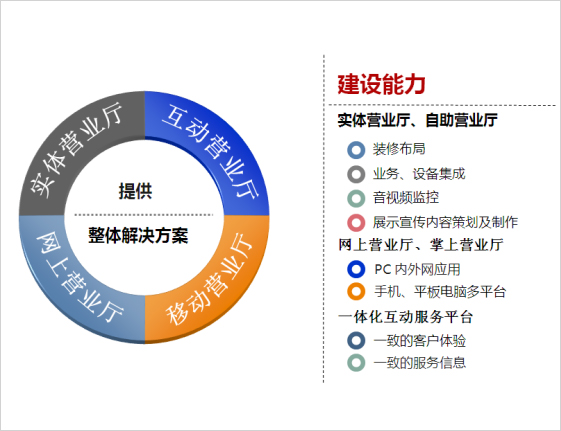 智能營業廳是綠色、智能、溫馨的一站式新概念智能電網成就展示平臺,是國家電網公司95598光明服務工程一面亮麗的旗幟。該解決方案按照“以客戶為中心”的設計理念,采用靜心的裝修設計,改進功能分區,借助信息通信、計算機網絡、智能控制等技術,構建實體、自助、網上和手機四位一體的多功能營業廳,實現服務智能化、互動化、多樣化感觀式服務體驗,為客戶提供靈活多樣的信息交互、業務受理、繳費靈活多樣的24小時服務。同時,該解決方案實現對營業廳可視化在線管理。