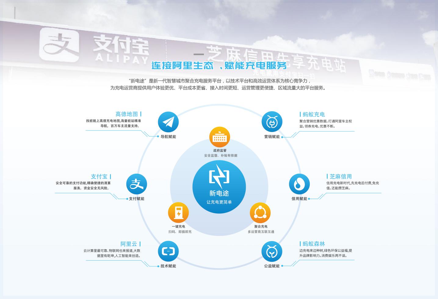 此外,新電途還聯合支付寶、高德地圖,實現一鍵掃碼充電服務。引入支付寶 “花芝”(芝麻信用+花唄)體系標準,開啟信用充電”新模式,新能源車主可在區域范圍內支持支付寶掃碼充電的充電站或充電樁給愛車充電,讓車主享受先充電后付費的便捷體驗服務。